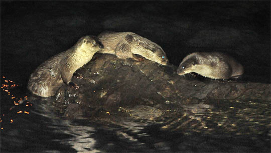 지난해 전주천에 나타나 둥지를 튼 수달이 짝짓기를 한 뒤 새해를 맞아 나들이에 나섰다. 도민들에게 세배를 올리려고 작정한걸까. 좀처럼 한 곳에 모이지 않는 수달 가족이 2일 새벽 3시 24분 치명자산 앞 쪽 전주천 수중 바위에서 처음으로 카메라에 잡혔다.