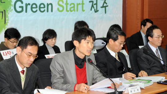 3일 전주시청 회의실에서 열린 전주시 기후변화 민관 실천계획 발표 기자회견에서 최두현 전북환경운동연합 국장이 저탄소 녹색성장을 위해 시민과 함께 실천할 21개 과제를 발표하고 있다.