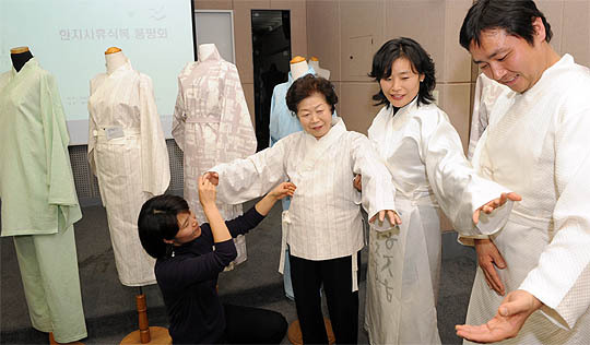 2009 한지사 휴식복 전문가 품평회가 6일 전주정보영상진흥원에서 열려 참석자들이 한지로 만든 휴식복을 입어보고 있다.