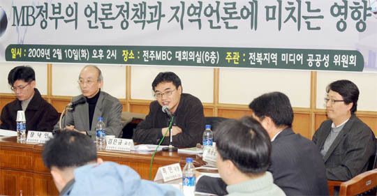 10일 전주MBC 대회의실에서 열린 전북기자협회와 지역미디어공공성위원회 공동주최로 열린 정부의 언론정책과 지역언론에 미치는 영향에 대한 토론회에서 김은규 우석대 교수(왼쪽에서 세번째)가 발제를 하고 있다.