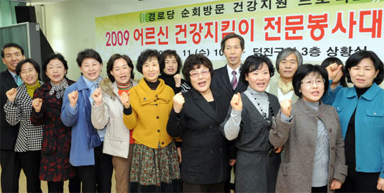 전주시 덕진구 관내 경로당 순회방문 건강지원 프로젝트인 2009 어른신 건강지킴이 전문봉사대 발대식이 11일 전주 덕진구청 상황실에서 열려 봉사대원들이 파이팅을 하고 있다.