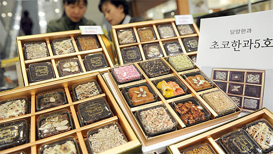 밸런타인데이를 3일 앞둔 11일 롯데백화점 전주점에 한과에 초콜릿을 곁들인 초코한과가 선보여 눈길을 끌고 있다.