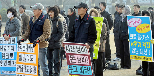 공공노조 전북평등지부 조합원들 50여명이 11일 전주시청 노송광장에서 임단협 결의대회를 갖고 있다.
