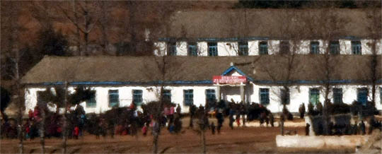 김정일 국방위원장의 67회 생일인 16일 황해북도 개풍군 림한리 민정정찰대대 연병장에 북한 주민들ㅇ 모이고 있다. 파주 오두산 통일전망대에서 바라본 모습.