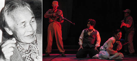 생전의 박동화 선생(왼쪽)과 후배 연극인들이 선생을 소재로 해 만든 연극 '독백'의 한 장면. (desk@jjan.kr)
