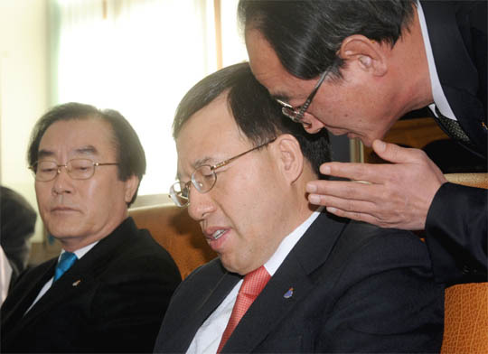 23일 전북도교육청에서 열린 '임실교육청 학업성취도 평가 관련 2차 조사결과 발표'에서 김찬기 부교육감이 기자의 질문에 머뭇거리자 정우길 감사담당관이 귓속말로 내용을 전하고 있다.