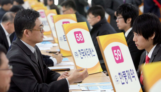 26일 전주 고용지원센터에서 열린 취업박람회에서 구직자들이 면접을 보고 있다.