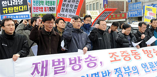 전북언론노조협의회 등 도내 언론관련 단체로 구성된 '전북지역 미디어공공성위원회'는 27일 한나라당 전북도당 앞에서 "한나라당은 미디어법 날치기 상정을 사과하고 법안을 즉각 폐기하라"는 구호를 하고 있다.