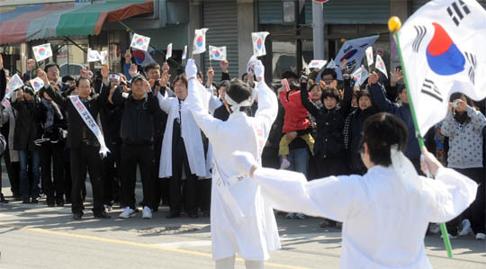 올해로 90주년인 3·1절을 맞아 정읍시 태인면에서 열린 태인 만세운동 재현 행사에서 시민들이 그날의 함성을 재현하고 있다.