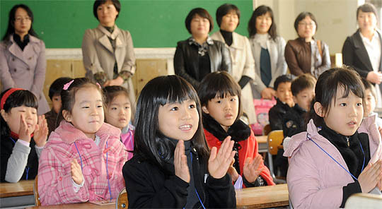 2일 전주 전일초등학교 입학식에서 신입생들이 선생님과 첫 만남을 가지고 박수를 치고 있다.