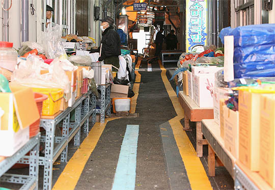 페인트로 반듯하게 칠해진 이 경계선이 도대체 뭐길래, 상인들이 넘어서지 않으려고 신경을 쓰는 걸까. 다소 컴컴한 시장 골목에서 유난히 눈에 띄이는 이 경계선의 의미가 궁금했다.