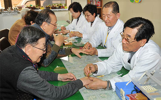 전주 안골노인복지관의 안골나눔수지침 동아리(서금요법) 회원들이 12일 복지관 주간 보호센터 노인들을 대상으로 수지침 봉사를 하고 있다.