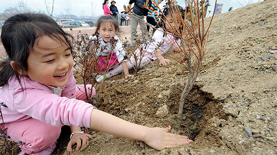 식목일을 보름여 앞둔 18일 전주 완산생활체육공원에서 열린 나무심기 행사에서 전주 코끼리 어린이집 원생들이 나무를 심고 있다.