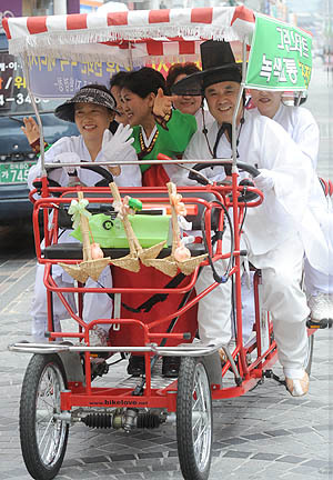 전주 한옥마을부터 차없는 거리까지 시범적으로 운행되는 자전거버스가 전주시내를 돌며 거리 홍보를 하고 있다.
