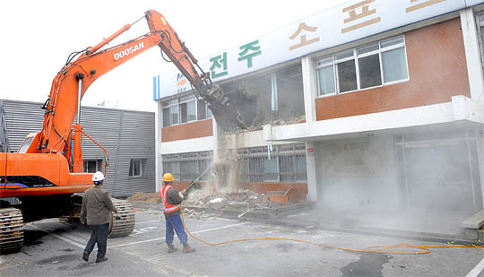 20일 전 안기부건물인 전주소프트웨어 지원센터를 포크레인을 이용하여 철거를 하고 있다.