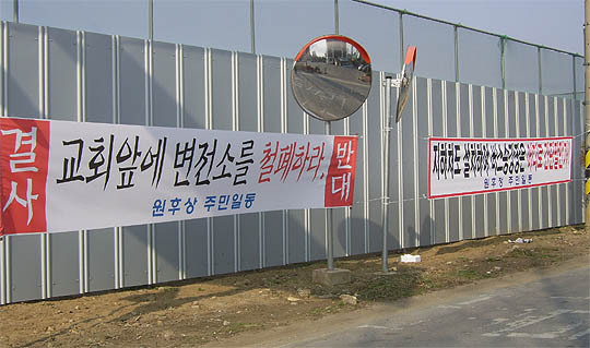 주민들이 플래카드를 걸고 삼례읍 후정교회 맞은 편 보조 급전구분소 설치를 반대하고 있다. (desk@jjan.kr)