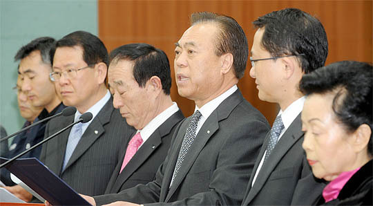 한국노총전북본부와 전라북도 상공회의소협의회, 사)전북경제살리기도민회의 공동대표단들이 23일 전북도청에서 노동부 익산지청과 군산지청의 통합을 반대한다는 기자회견을 하고 있다.
