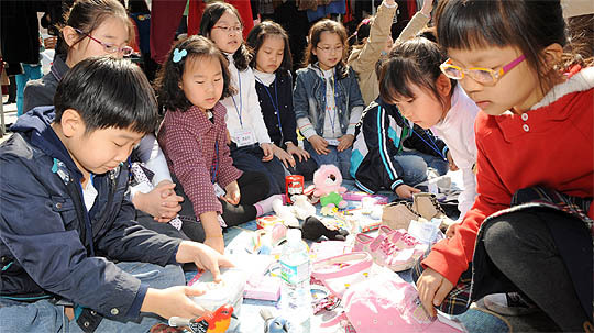 지난 28일 전주 경기전에서 열린 '봄맞이 녹색 온고을 나눔장터'에 참여한 학생들이 직접 챙겨온 물건들을 판매하고 있다.