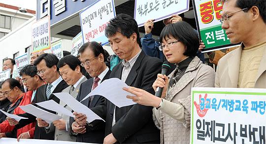 전북지역 시민단체인 사회공공성.공교육강화 전북네트워크는 30일 전북교육청 앞에서 내일 치뤄지는 진단평가는 학교와 학생을 서열화하는 비교육적인 시험이며, 진단 평가를 거부하고 학생의 신청을 받아 당일 체험학습을 진행한다는 기자회견을 하고 있다.