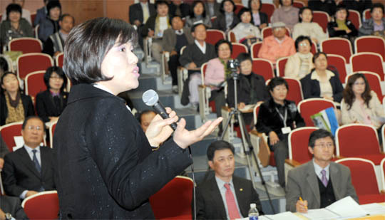 지난 31일 전주 역사박물관에서 열린 2009 전라북도 문화관광해설사 스토리텔링 경진대회에서 부안군 고윤정 문화관광해설사가 내소사 고려동종과 범종각 사물이야기를 주제로 설명을 하고 있다.