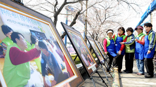 2일 전주 덕진구청 광장에서 열린 4월의 벚꽃과 함께하는 자원봉사 사진전에서 시민들이 자원봉사 활동 사진을 보고 있다.
