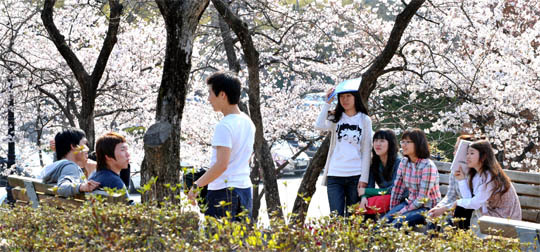 전주의 낮 최고기온이 이달 들어 가장 높은 기온인 23.4℃를 기록한 7일 벚꽃이 만개한 전북대 교정에서 반소매를 입은 학생들이 휴식을 취하고 있다.