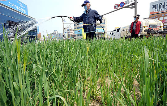 8일 전북도교육청 앞 서중로타리에 보리들이 초록 빛깔을 내며 자라고 있다.