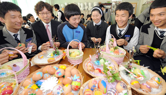 부활절을 3일 앞둔 9일 전주 해성고등학교 1-2학년 전교생들이 35사단 장병과, 인근 주민과 양로원에게 전달할 사랑의 부활절 달걀을 만들고 있다.