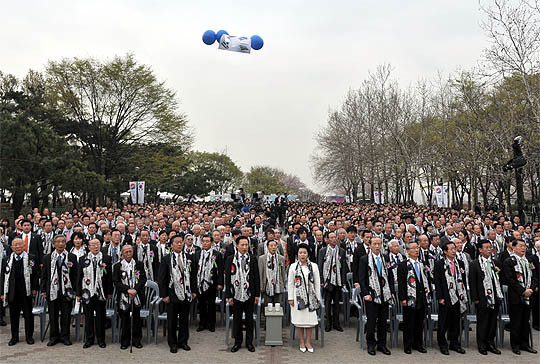 13일 오전 남산 백범광장에서 열린 제90주년 대한민국 임시정부수립 기념식에서 이명박 대통령을 비롯한 참석자들이 기념노래를 부르고 있다.