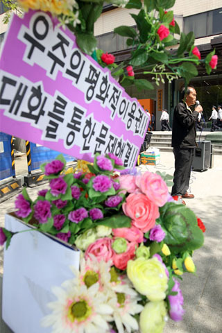 시민단체 '평화와 통일을 여는사람들' 회원이 14일 오후 서울 광화문 미대사관 근처에서 열린 반미연대집회에서 북한 인공위성 발사를 비난한 유엔 안보리 의장 성명을 규탄하고 무건리 훈련장 확장 반대를 주장하고 있다.