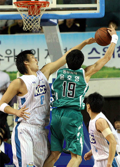14일 전주실내체육관에서 열린 프로농구 4강 플레이오프 전주 KCC와 원주 동부 경기에서 KCC 하승진이 동부 윤호영의 레이업슛을 블로킹하고 있다.