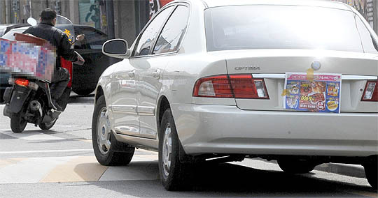 16일 전주 동부시장 인근 도로에 세워진 차량. 주정차단속 카메라에 찍히지 않기 위해 차량 번호판을 홍보지로 가려 놓았다.