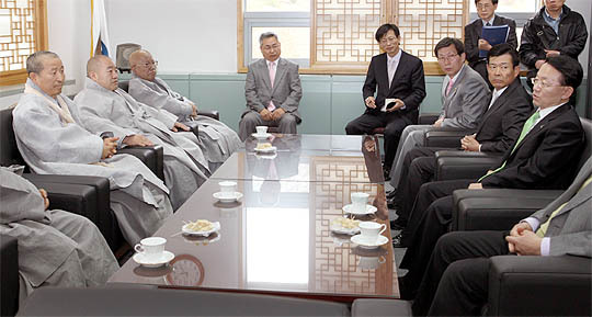 16일 대전 국립문화재연구소에서 김완주 지사가 금산사 주지 원행스님과 미륵사지 발굴유물 진신사리 친견을 앞두고 대화를 나누고 있다.
