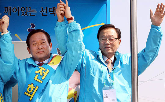 한나라당 박희태 대표가 지난 17일 전주 모래내 시장에서 전주 덕진에 출마한 전희재(왼쪽) 후보의 지지를 호소하고 있다.
