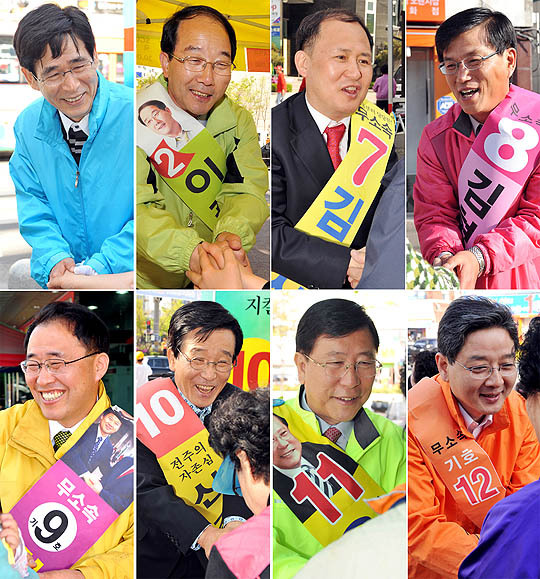 4·29 재선거 완산갑 후보자들이 거리 곳곳에서 자신의 지지를 호소하며 시민들과 악수를 하고 있다. 윗줄 왼쪽부터 기호순 1.태기표(한나라당) 2.이광철(민주당) 7.김대식(무소속) 8.김형근(〃) 9.김형욱(〃) 10.신 건(〃) 11.오홍근(〃) 12.이재영(〃) 후보.