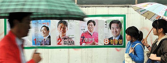 모처럼 단비가 내린 20일, 4·29 재보선을 알리는 선전 벽보가 나붙었다. 가뭄 끝에 내리는 비가 하루종일 계속돼도 부족하듯, 유권자들 역시 항상 올바른 정치에 목이 마르다.