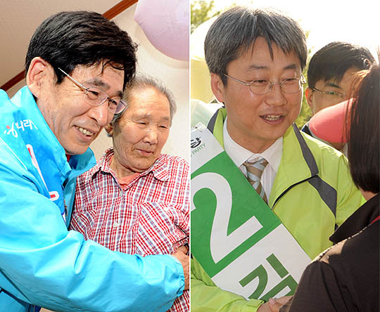 (사진 왼쪽) 덕진에 출마한 김근식 민주당 후보가 유권자에게 자신의 지지를 호소하며 악수를 하고 있다.