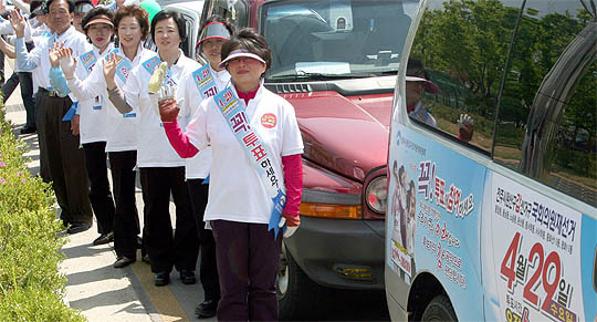 4·29 재선거를 일주일여 앞둔 22일 투표참여를 알리는 방문홍보단들이 차량을 이용해 투표참여 분위기 조성을 위한 거리캠페인을 하고 있다.