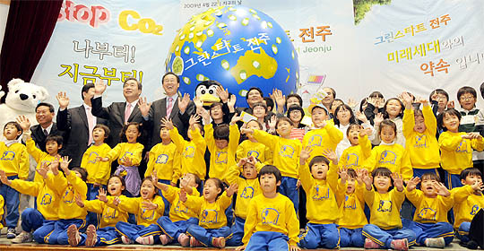 22일 전주시청 강당에서 열린 그린스타트 전주 발대식에서 아이들이 탄소를 줄여 깨끗한 전주를 만들자는 손을 흔들고 있다.