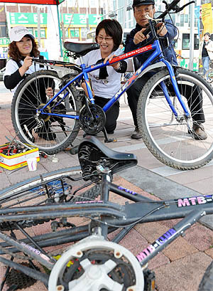 23일 전주덕진지역자활센터 두바퀴로 여는 자활사업단 회원들이 오거리 문화광장에서 중고 자전거를 수리하고 있다.