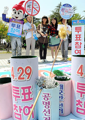 전주 덕진구 선관위 직원과, 투표참여 방문 홍보단들이 4.29 국회의원 재선거를 하루 앞둔 28일 전북대학교에서 학생들에게 전통 놀이를 투호를 이용하여 투표 참여 홍보 활동을 하고 있다.