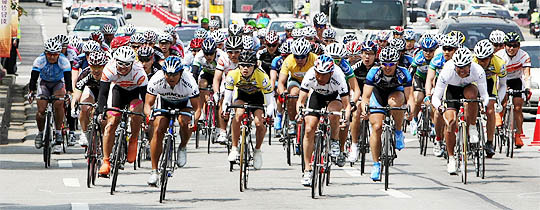 자전거 타기 붐 조성을 위해 지난 25일부터 5월3일까지 전국 16개 시·도를 순회하는 `제1회 대한민국 자전거 축전'의 광주 구간 행사가 30일 열려 참가자들이 광주시청 앞을 힘차게 달리고 있다.
