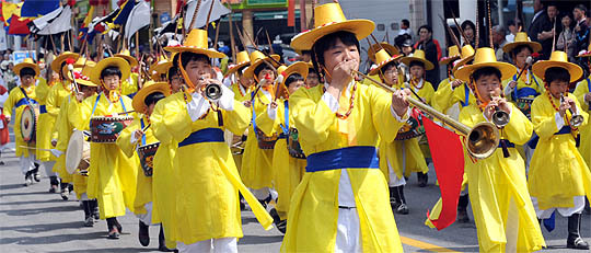 남원 춘향제 대동길놀이 행사에서 남원 도통 초등학교 취타대들이 남원 시내를 돌며 축제를 알리고 있다.