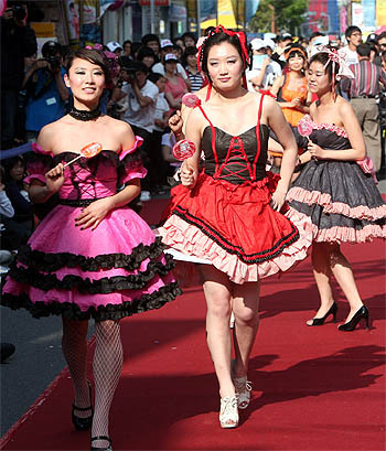 3일 영화의 거리에서 한지로 된 코스튬의상을 입은 모델들이 주위의 시선을 받으며 워킹을 하고 있다.