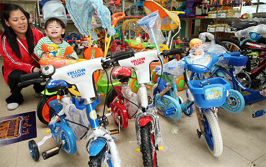 어린이날을 하루 앞둔 4일 장난감 가게에서 친구들과 함께 자전거를 타고 달릴 생각에 들뜬 아이가 자전거를 고르며 해맑게 웃고 있다.