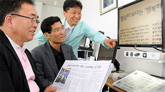 14일 전주시 서신동 온누리정영택안과 6층에 문을 연 저시력인센터에서 오규정 대표와 저시력인들이 데스크탑형 독서확대기 모니터를 통해 신문을 보고 있다.