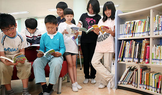 진안군 성수면 외궁초등학교의 학생들이 새로 생긴 도서관에서 보고 싶은 책들을 골라 책 삼매경에 빠져 있다.