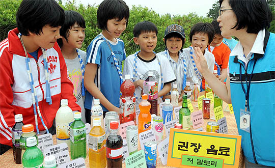 16일 전주 천변 야외무대에서 열린 건강체험 한마당 행사에서 학생들이 전주시보건소 직원으로부터 건강한 식단과, 저칼로리 음료에 대한 설명을 듣고 있다.