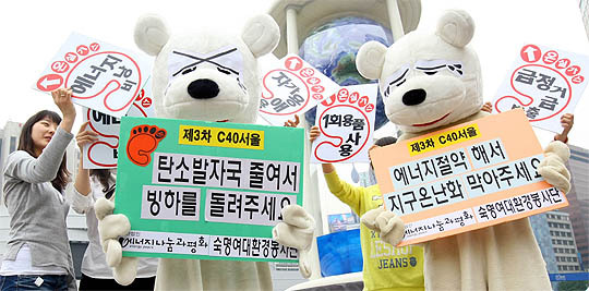 제3차 서울 C40 기후정상회의의 개막을 앞두고 숙명여대 환경봉사단 학생들이 15일 오전 서울광장에서 저탄소 생활의 실천으로 북극곰에게 빙하를 돌려주자는 내용의 퍼포먼스를 하고 있다.