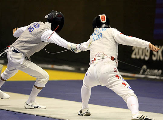 18일 오후 서울 올림픽공원 제2체육관에서 열린 SK텔레콤 국제그랑프리 펜싱 선수권대회 남자 플러레 예선에서 고재원(오른쪽)이 인도의 사르브프리트 싱 딜런을 상대로 공격을 시도하고 있다.
